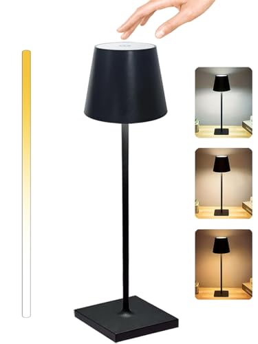 Rechargeable Lamp with 3 Color Modes, Metal Cordless Lamps Touch Dimming, Wireless Lamp IP54 Waterproof, Rechargeable Table Lamp for Restaurant Bedroom Indoor Outdoor, Black
