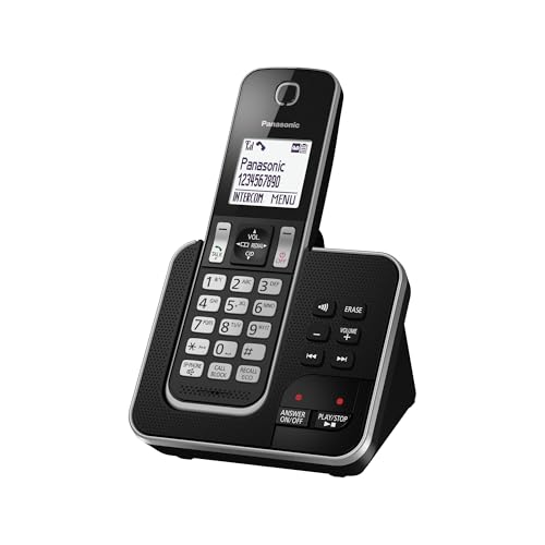 Panasonic KX-TGU433EB Digital Cordless Landline Phone with Answering Machine, Base Unit & 3 Handsets, 2.1” (5.3 cm) LCD Display, Fav Call, Torchlight, Hearing Aid Compatible, Black & Silver