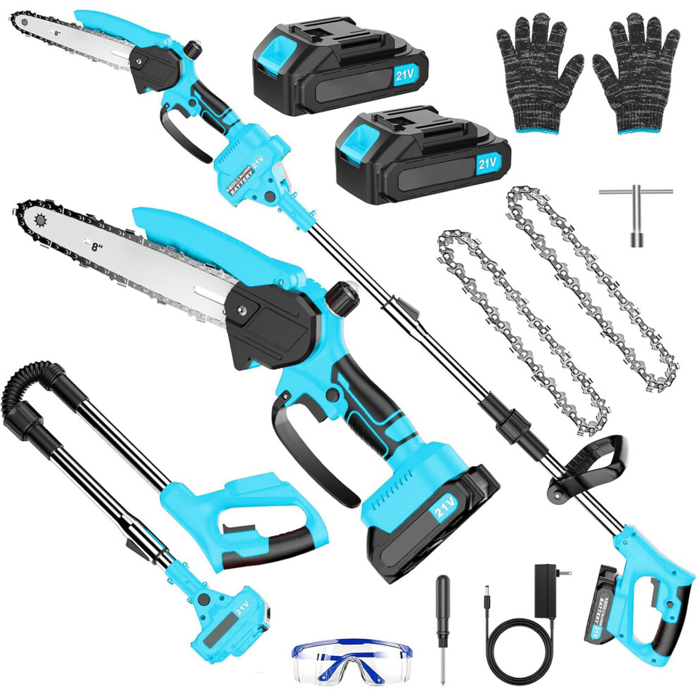 Mini Chainsaw Cordless with Foldable Pole Saw,6 Inch Electric Chain Saw with 2 Batteries & 2 Chains,Telescopic Motor Head 180° Swiveling Tree Saw for Tree Trimming,Garden,Wood Cutting (Blue)