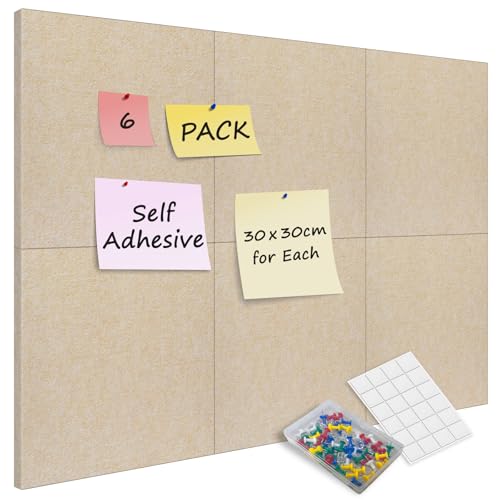 Sliandtelly Felt Pin Boards 6 Pack, 12mm Thick Felt Cork Board Tiles with 60 Pins, Removable Adhesive Large 60 x 90 cm Notice Board for Home Kitchen Office Pinning Wall Note Memo Notice Photo, Beige