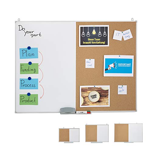 Relaxdays Combination Board, 2 in 1, Cork Pin Board & Magnetic Board, Aluminium Frame, Combination Board with Shelf, 90 x 120 cm, White/Natural
