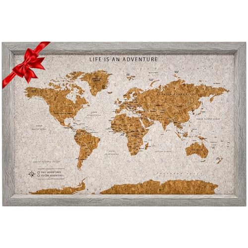 Splosh Large Maps. World Map Pin Board in Grey, Wooden Frame. World Map Cork Board with 100 Pins in 2 Colours to Mark Your Past and Future Adventures. Framed World Maps for Wall. (Grey)