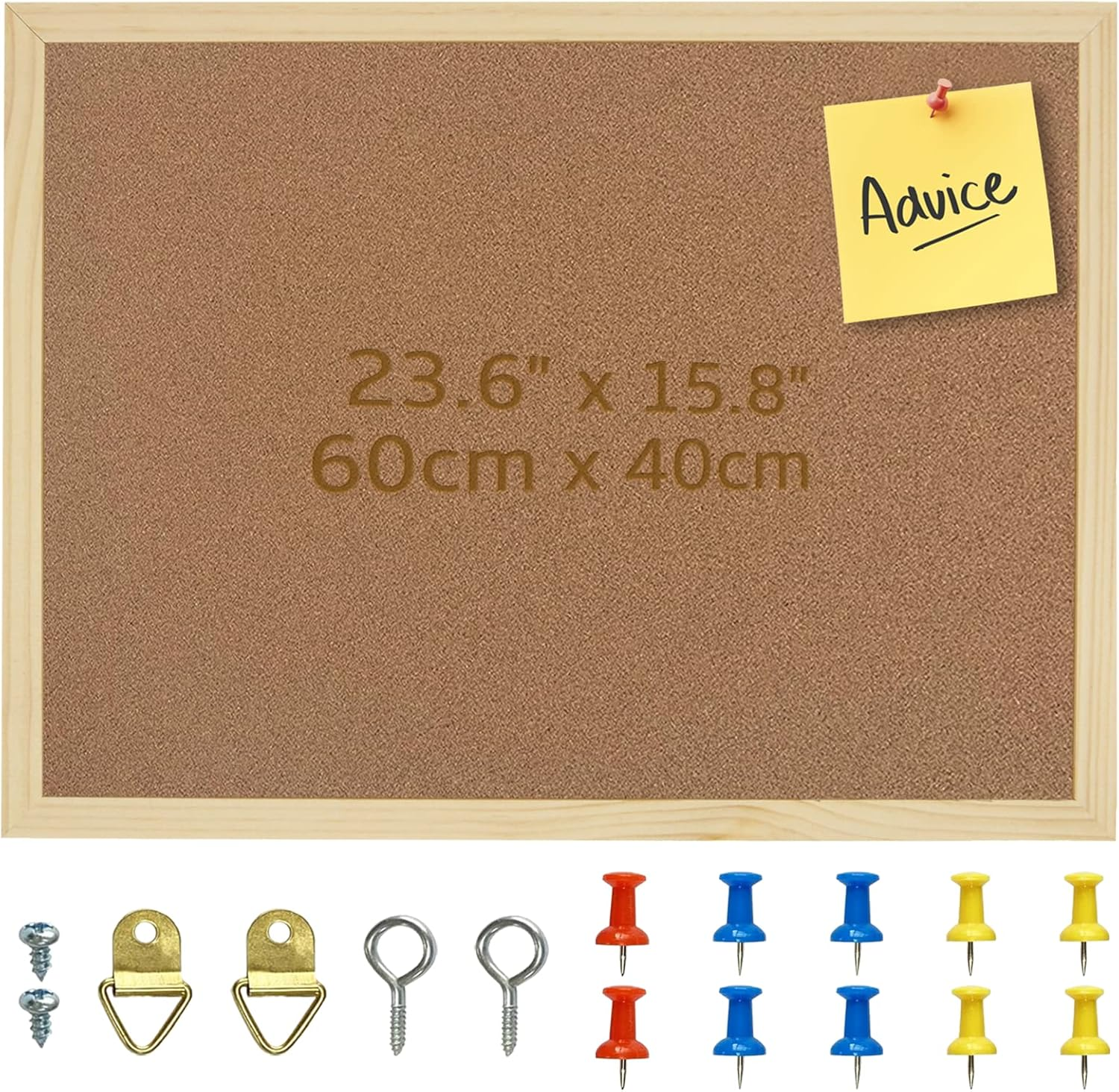 OWLKELA 60x40cm Thicken Cork Notice Pin Memo Board with 10 Pushpins and Hanging Rings Vision Bulletin Board for Office, Classroom or Home Classic Wooden Frame