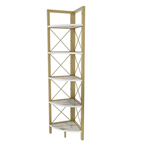 FAVOOSTY Coner Shelf Unit Narrow Corner Bookcase Bookshelf Free Standing Shelf Glass & Metal Display Cabinet Ladder Shelf Storage for Living Room Bedroom, Gold