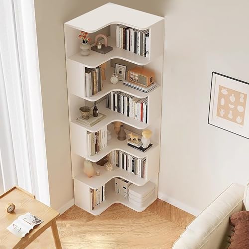 zktoermn Solid Wood Minimalist Corner Bookshelf, Bookcase, Multi-Layered and Wall-Leaning, Freestanding Storage Shelf for Home Office, Living Room, Kitchen, Bedroom(White)