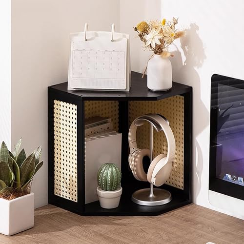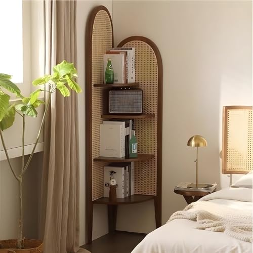 Aiupuyer Solid Wood Rattan Triangular Cabinet, Multi-Functional Corner Shelf 4-Tier Floor Standing Bookshelf for Living Room, BedroomNatural Vintage Corner Bookshelf with Rattan Bookcase