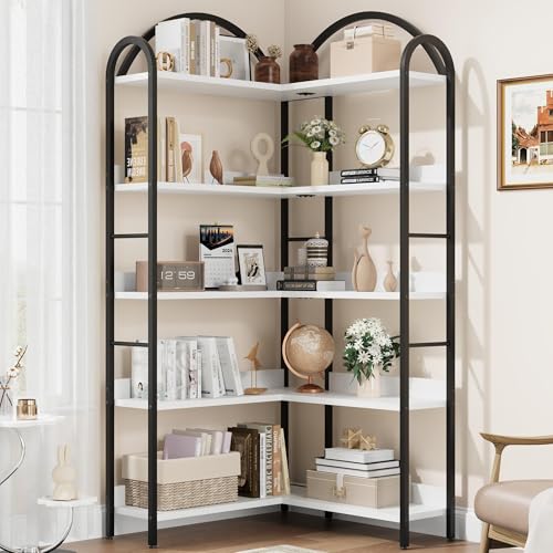 Aptliton Corner Bookshelf Industrial Bookcase, L Shaped Arched 5 Tier Corner Shelf, Large Bookshelf with Metal Frame, Etagere Shelf Corner Display Rack for Living Room Bedroom