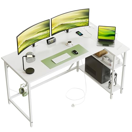 DOMSHOCT Small L Shaped Gaming Desk with Power Outlets, 140x70cm Corner Computer Table with Large Reversible Storage Shelves, Home Office PC Workstation with Hooks for Writing Study, White
