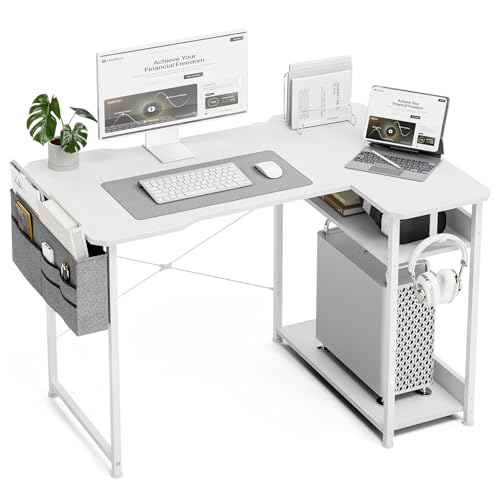 CubiCubi L Shaped Corner Desk, 120x70 cm Computer Desk with Storage Bag, Small Writing Table with Large Reversible Storage Shelves, Workstation for Study Play Work Home Office, White