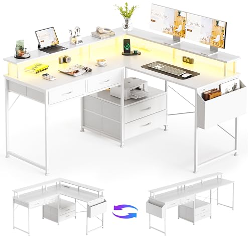Lufeiya White L Shaped Computer Desk with Fabric Drawers, 55 Inch Corner Home Office Desk with Monitor Stand Shelves, Writing Study Gaming Desks with Led Lights and Power Outlets for Bedroom, White