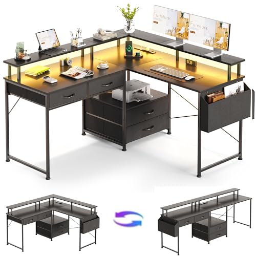 Flrrtenv 130x120cm L Shaped Desk with LED Lights & Power Outlets, 4 Drawers Reversible Gaming Corner Computer Desks for Workstation, Home Office Desks with Monitor Shelf & Storage Shelves Black