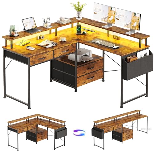 Flrrtenv 130x120cm L Shaped Desk with LED Lights & Power Outlets, 4 Drawers Reversible Gaming Corner Computer Desks for Workstation, Home Office Desks with Monitor Shelf & Storage Shelves Rustic Brown