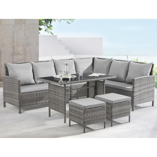 EVRE Madison 7 Seat PE Rattan Garden Furniture Set UV-Resistant Corner Sofa Glass Dining Table 2 Stools & Chairs with Cushions Outdoor Patio Set for Balcony Lawn Conservatory Steel Frame (Grey)