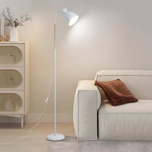Amdelne Adjustable White Floor Lamp, White Modern Corner Lamp Floor Light, Standing Lamps for Living Room, Bedroom, Dining Room, Office, 155cm, Metal, Wood, E27 (Bulb Not Included)