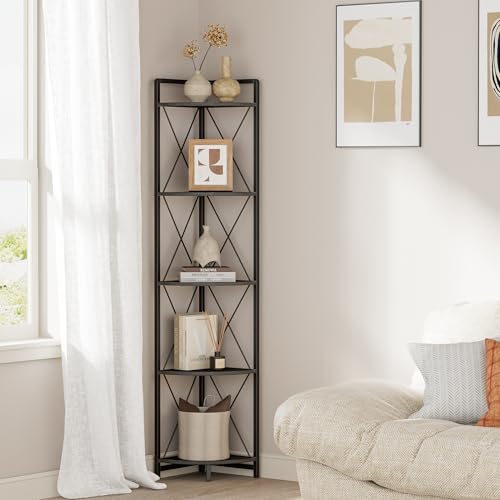 Cerlyunzan 5 Tier Corner Shelf Stand, 64" H Tall Industrial Corner Bookshelf for Living Room Decor, Metal Corner Shelf, Plant Stand Display Shelf for Bedroom, Bathroom, Small Space, Black