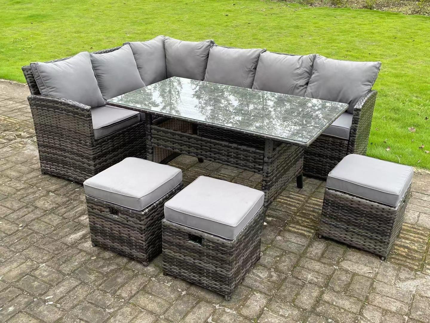 9 Seater High Back Dark Mixed Grey Rattan Corner Sofa Set Outdoor Furniture Rectangular Dining Table