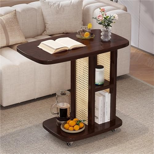 C-Shaped Side Table with Wheels, Rustic Rolling Sofa Bedside End Table, Boho Rattan Accent Tables, Small Corner Storage Tables for Living Room Bedroom Apartment & Small Space(50cm/19.7in)