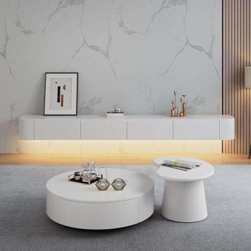 Btsunotr Floating tv unit Floating TV Cabinet Wall Mounted Home Storage Cabinet With Doors Entertainment Media Console Solid Wood Modern Living Room Round Corner (WHITE+NEW, 280CM)