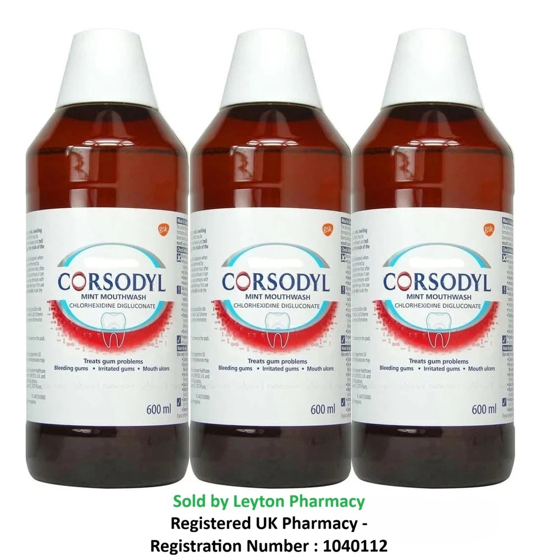 3 X Corsodyl Mint Mouthwash 600ml sold by Leyton Pharmacy