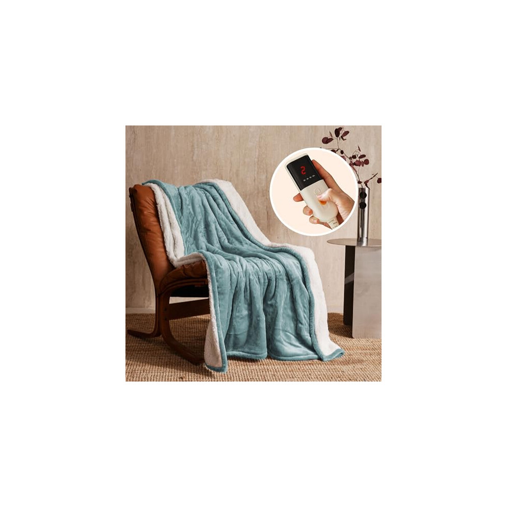 CURECURE Electric Heated Blanket Throw, Soft Ribbed Flannel and Sherpa Heated Blanket, 180 X 130cm, 6 Heat Settings & 1-10 Hours Automatic Timer, Home and Office Use, Machine Washable (Greyish Green)