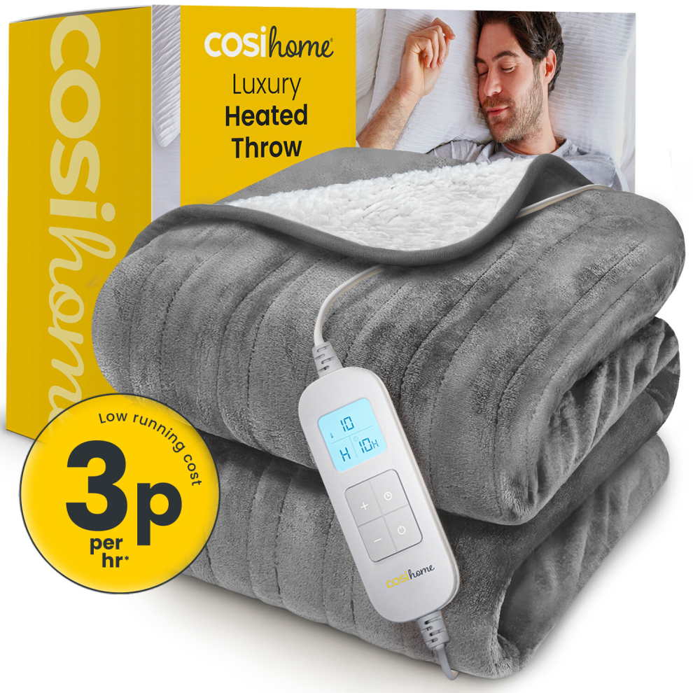 Cosi Home® Luxury Heated Throw - Electric Blanket - Extra Large Heated Blanket, Machine Washable Fleece with Digital Remote, 10hr Timer and 10 Heat Settings (Grey)