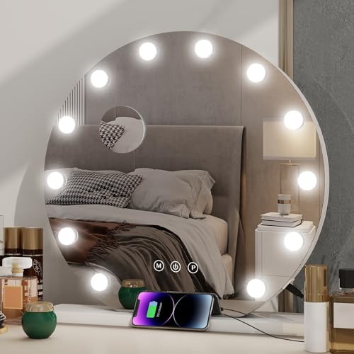 Kwanner Hollywood Vanity Cosmetic Mirror with Lights, 50cm Round Makeup Mirror, Makeup Mirror with 12 Dimmable LED Bulbs, USB Output Port, 3 Lighting Modes, Tabletop and Wall Mounted For Bedroom