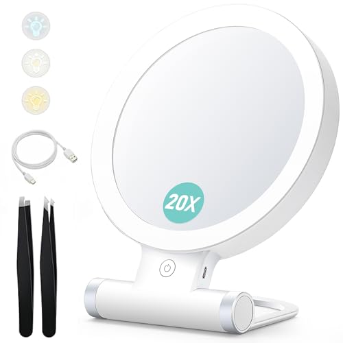 Magnifying Mirror with Light,20X/1X Double Sided Tabletop Portable Lighted Makeup Beauty Mirror, 3 Color Lighting, Dimmable Touch Screen,Cosmetic Mirror with Lights for Makeup/Travel