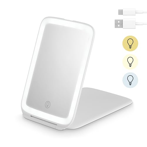 Rechargeable Makeup Vanity Mirror with 72 Led Lights, Lighted Travel Portable Light up Beauty Mirror, 3 Color Lighting, Dimmable Touch Screen, Tabletop Desk LED Foldable Cosmetic Mirror with Lights