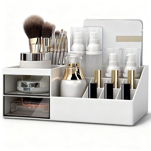 NWK Makeup Organiser Large Cosmetic Brush Holder Display Storage Box Bag Bathroom Dresser Desk Office Storage Organizer with 2 Drawers and 11 Compartments (White)
