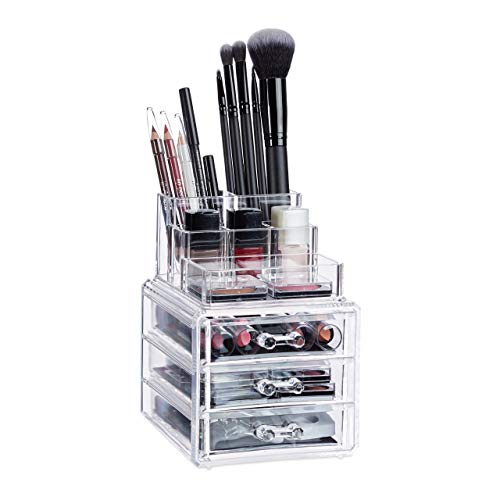 Relaxdays Acrylic Make Up & Cosmetic Organiser with 4 Drawers, Upright / Horizontal, Storage Box, HWD: 25x17.5x6.5 cm, Transparent