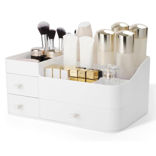 Subsky Makeup Organiser with Drawers, Make Up Storage Cosmetic Dressing Table Organiser Makeup Box with Drawerds for Dresser, Bedroom, Bathroom (White)