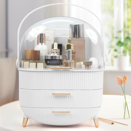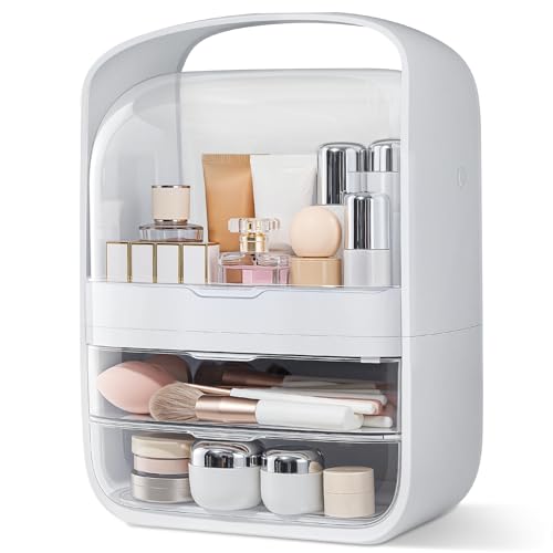 ASAB Cosmetic Storage Box with Lid Makeup Storage Organiser Box Waterproof and Dustproof Portable Handle Large Makeup Display with 3 Drawers Fully Open Clear Lid for Dressing Table Bathroom Bedroom