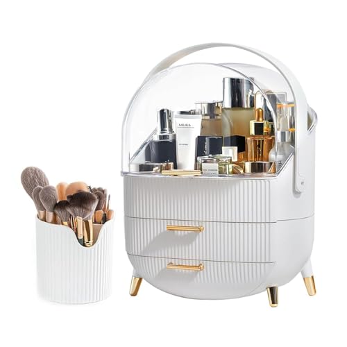 Makeup Organiser Holder with Lid Cosmetic Storage Case Ivory White Beauty Essential Box Dust Free Waterproof Cover Portable Handle Fully Open Drawers Bathroom Countertop Bedroom Dresser