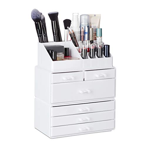 Relaxdays Organiser with 6 Drawers, 22 Compartments for Makeup Storage, Acrylic Cosmetic Tower, White, 29 x 23.5 x 14 cm