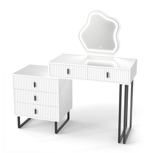 Multigot Dressing Table with Leaf-Shaped LED Mirror, Wooden Fluted Vanity Desk with 3-Color Lights, 5 Drawers, Side Cabinet and Metal Legs, Cosmetics Table Bedroom Makeup Dresser for Girl Women