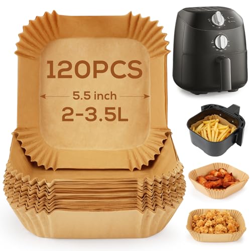 YQL Small Air Fryer Liners 5.5 Inch for Midea Compact/COSORI/Chefman Airfryer 2L, 120PCS Disposable Air Fryer Accessories Square, Non Stick Parchment Paper for Mini Single Basket Square/Round 2L-3.5L