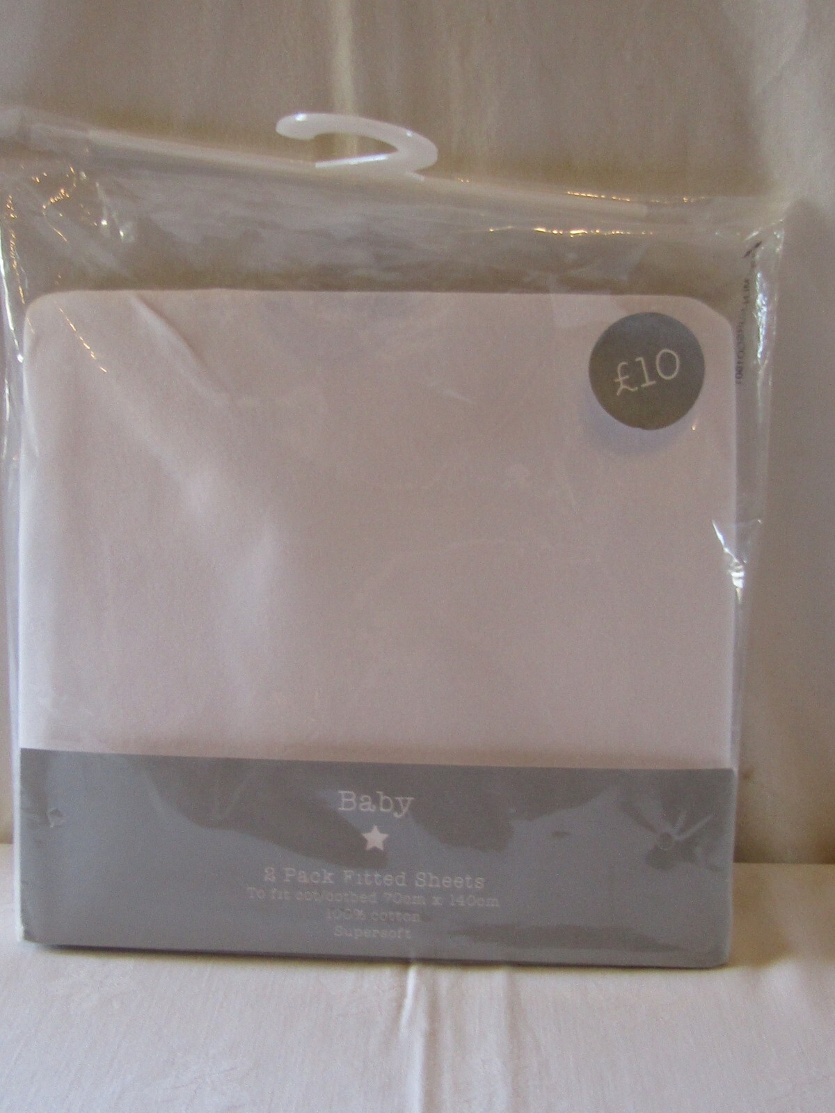 NEW FACTORY SEALED 2 x COT/COT BED FITTED SHEETS IN WHITE COTTON 70cm x 140cm.