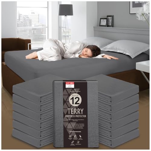 GC GAVENO CAVAILIA Terry Towelling Mattress Protector - Pack of 12 Cot Bed Waterproof Mattress Protector Fitted Sheet - Easy Care - Cot Bed Polycotton Mattress Cover for Bed (70 x 140cm) - Charcoal