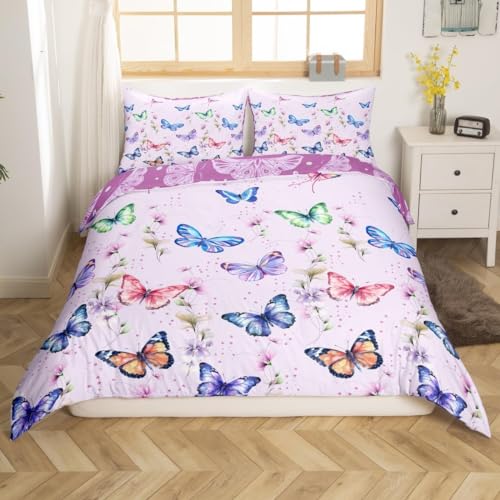 Loussiesd Girls Junior/Cot Bed Duvet Cover Butterfly Bedding Set 135x200cm with 1 Pillowcase Purple Reversible Bright Floral Print Bedding Set for Kids Colorful Butterflies Bedding 2 Pcs