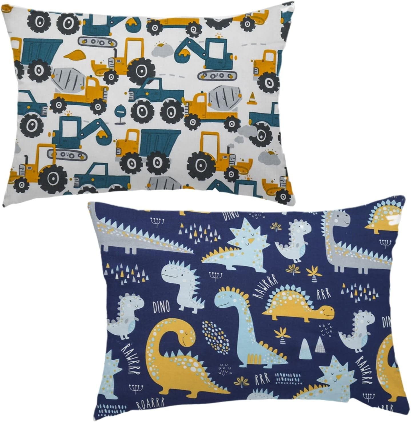 Baby Toddler Pillowcase, 2 Pack 100% Soft Cotton Cot Bed Pillow Pair Cases for Boys Girls Bedding, Kids Pillow Covers 40 x 60cm, Travel Small Pillow Pillowcase with Envelope Closure (Dinosaur+Tractor)