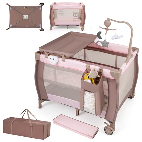 COSTWAY 3 in 1 Portable Travel Cot, Folding Baby Bassinet and Activity Playpen with Changing Table, Mattress, Music Box, Hanging Toys, Wheels and Carry Bag, Baby Crib Bed for Boys Girls (Pink)