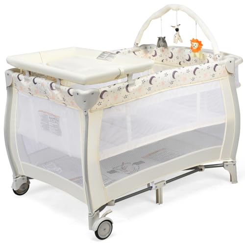 Maxmass 4 in 1 Baby Travel Cot, Folding Infant Crib with Mattress, Diaper Changer, Storage Pockets, 3 Hanging Toys, Lockable Wheels & Carry Bag, Portable Bedside Sleeper for Newborn