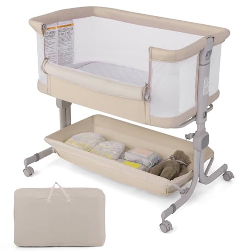 Dziranam Baby Bedside Crib,Co-Sleeper Crib with 3 Height Adjustments, Breathable Mesh, Travel Cot with Storage Basket & Wheels(KHAKI)