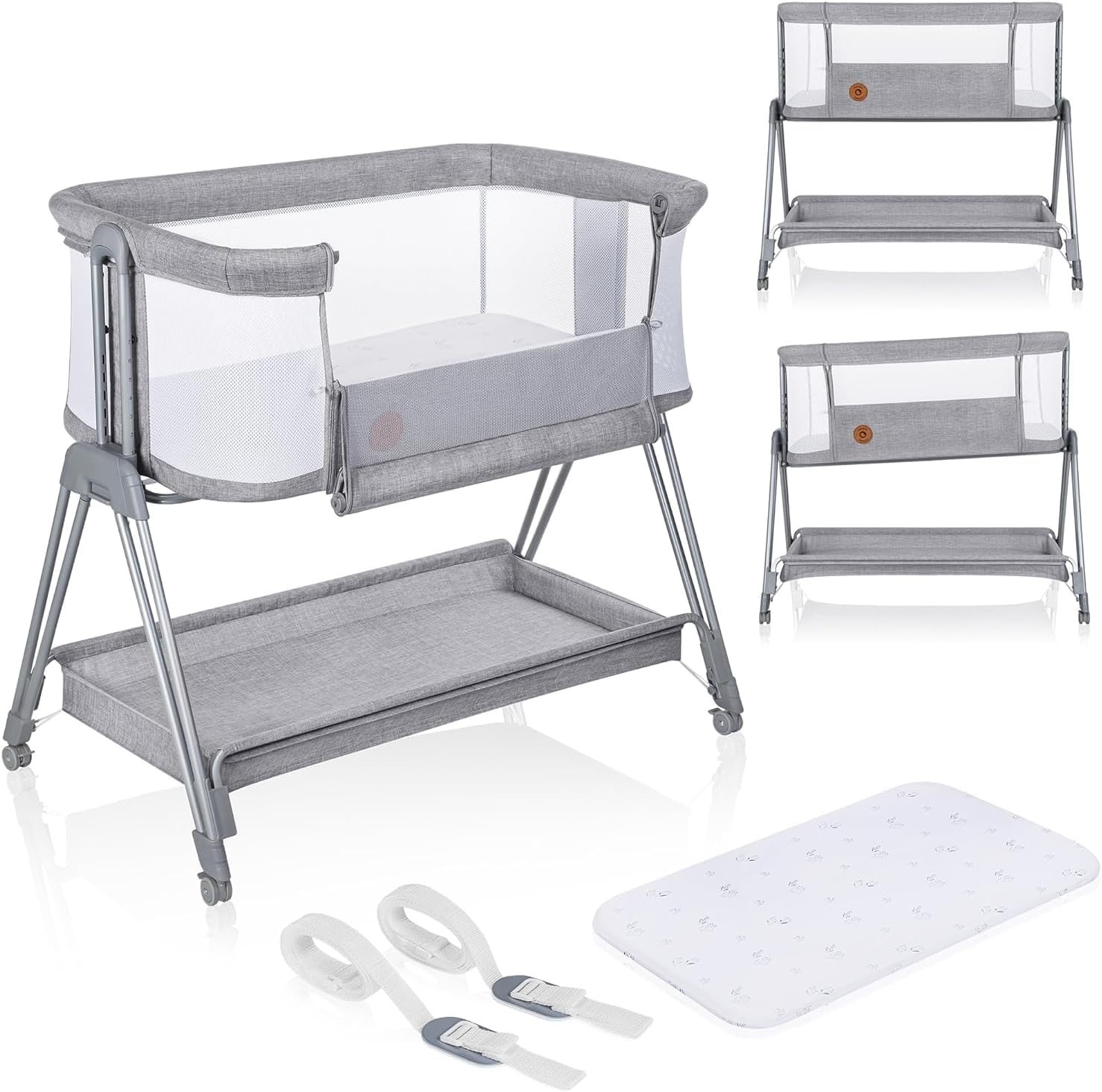 LADIDA 4 In 1 Baby Crib, Next to Me Crib, 6-Level Adjustable Bedside Easy Fold Travel Cot with Wheels, Storage, Mosquito Net and Matress Included, Portable Cribs for Newborn Infant (Grey)