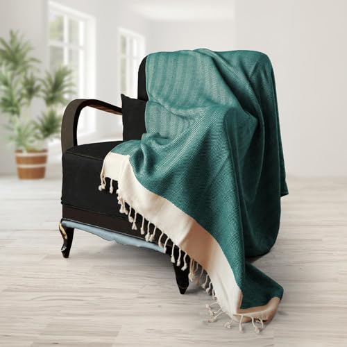 SMYRNA TURKISH COTTON Herringbone Series Throw Blanket 100% Cotton | Large 152 x 205 cm Wearable Cosy Blanket |Made in Turkey|Machine Washable|Premium Luxury Bath Towel&Picnic Rug-Petrol