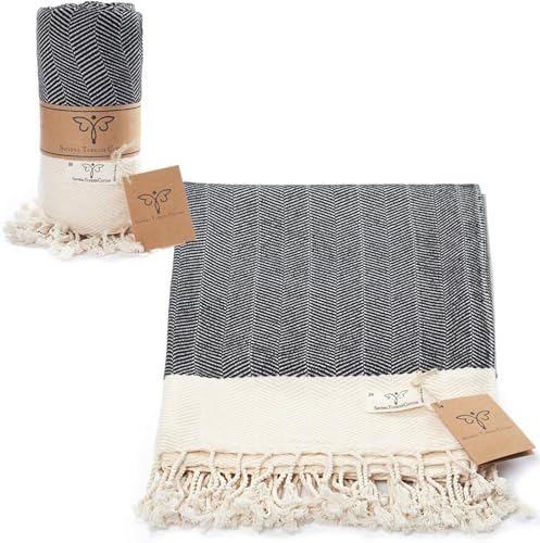 SMYRNA TURKISH COTTON Herringbone Series Throw Blanket 100% Cotton | Large 127x152cm Wearable Cosy Blanket | Made in Turkey | Machine Washable|Premium Luxury Bath Towel&Picnic Rug-Black