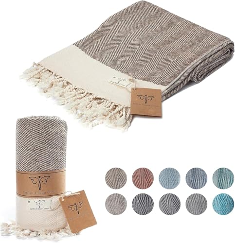 SMYRNA TURKISH COTTON Herringbone Series Throw Blanket 100% Cotton | Large 127x152cm Wearable Cosy Blanket | Made in Turkey | Machine Washable|Premium Luxury Bath Towel&Picnic Rug-Latte