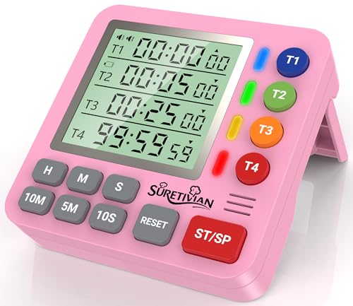 Digital Kitchen Timer for Cooking - 4 Channel Count Up Countdown Timer with Loud Alarm and Silent Mode, Large Display, Magnetic Back, Auto Memory for Classroom Study Gym, Battery Included (Pink)