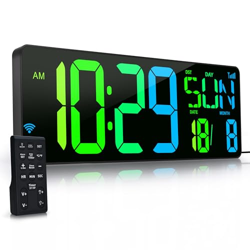 KRSTIR 17.2" Digital Wall Clock, LED Wall Clock with Remote Control Large Display Count Up & Down Timer, Adjustable Brightness Alarm Clock with Day/Date/Temperature for Home, Gym, Office