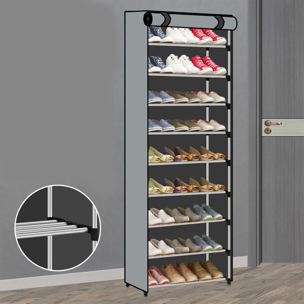 SparkFeng Tall Shoe Rack 10 Tier Large Capacity Dust Prevention Metal Structure Shoe Storage Cabinet with Cover for Doorway Entrance, Steel and Fabric Entryway Shoe Organizer (Gray)